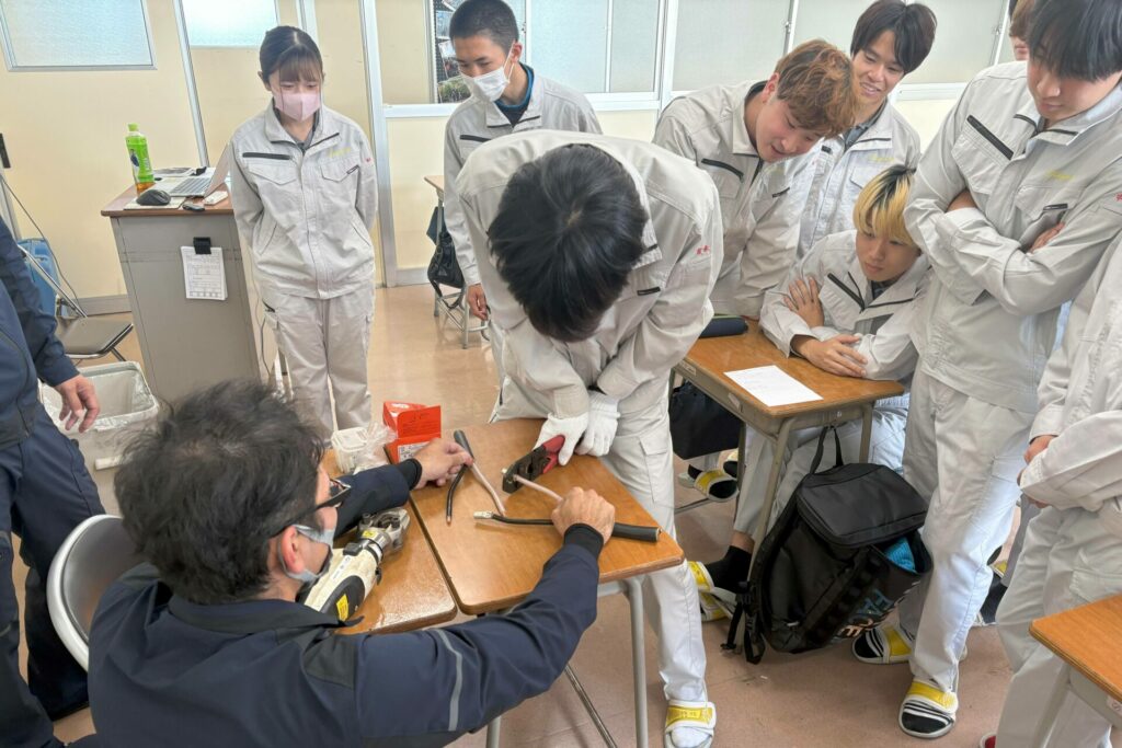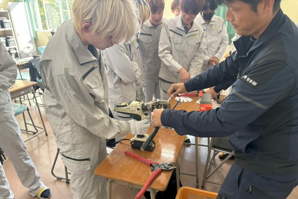 その他にも電気工事で使用する工具体験や高所作業車体験もさせていただき、学生たちもとてもニコニコしながら楽しそうでした。
